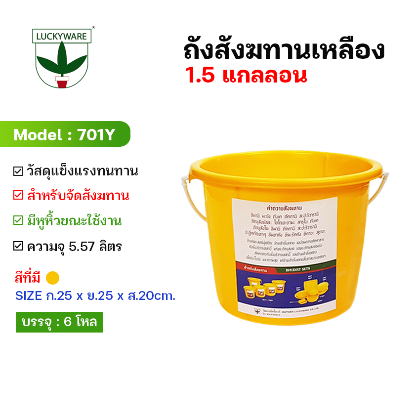 ถังน้ำพลาสติก 1.5 แกลลอน ขนาดกว้าง 25 ซม. สูง 22 ซม. ใช้บรรจุน้ำ เป็นถังสังฆทาน จัดชุดถวายพระ หรือจัดชุดทำบุญ